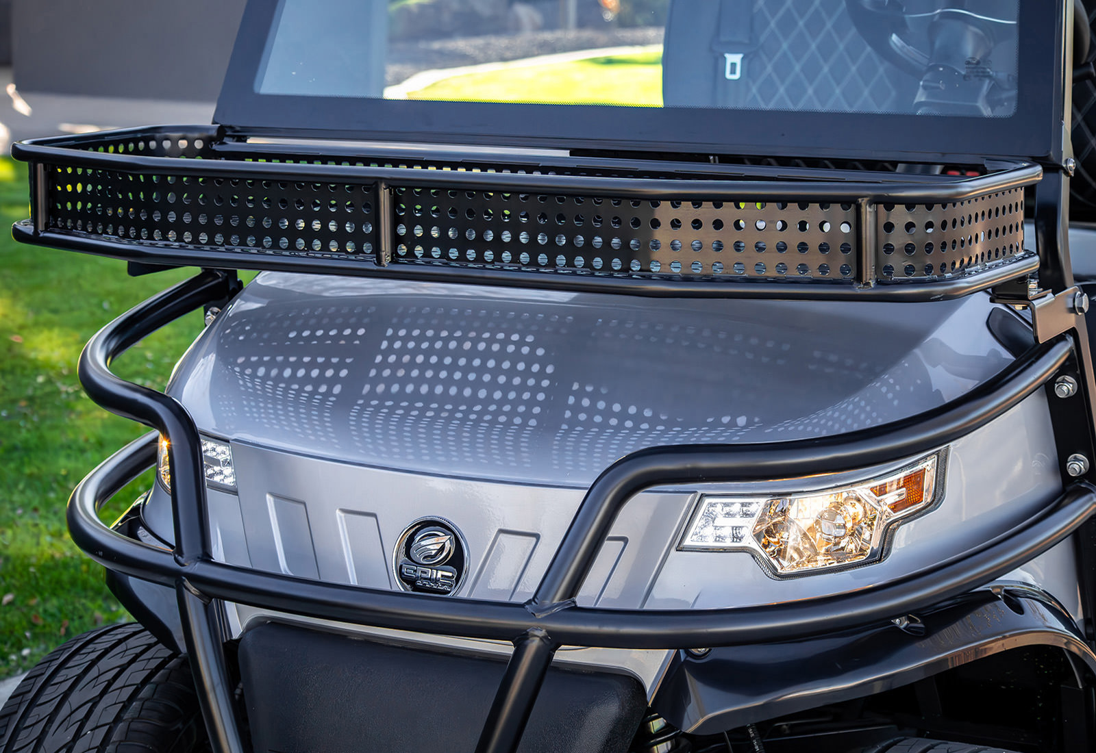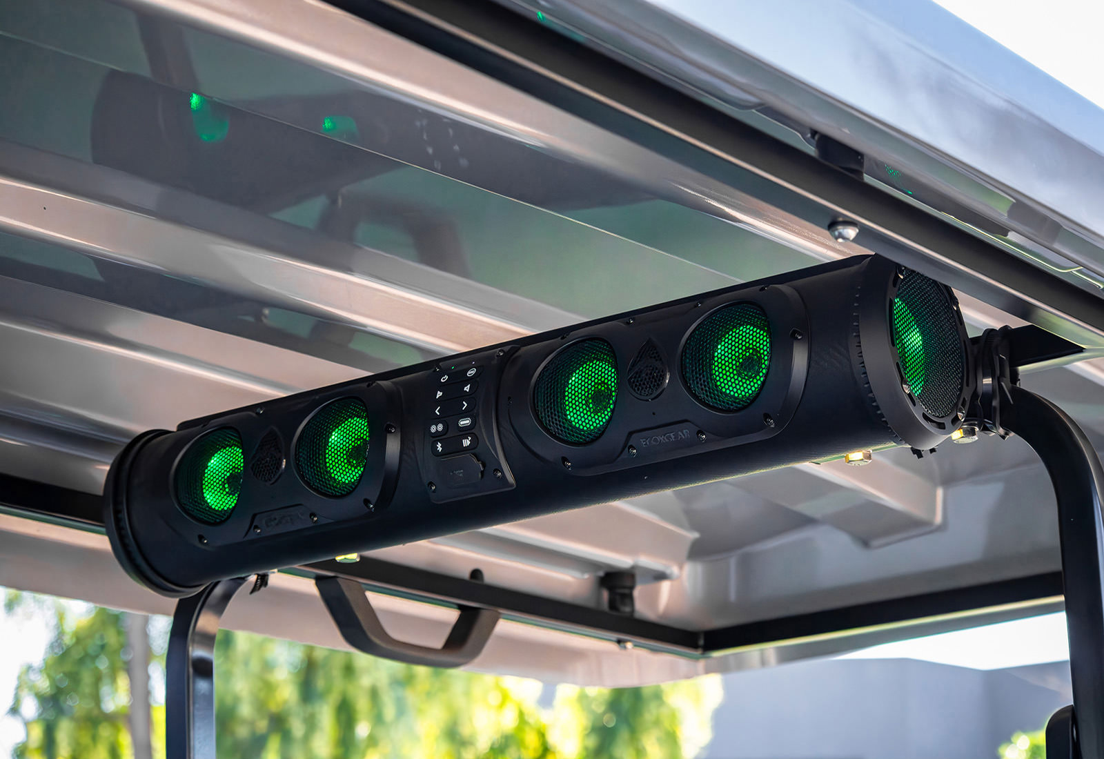 This 4-seater golf cart features DOT-approved LED lighting, an insulated wire harness, a digital speedometer, a backup camera, and luxurious high-back seats with color-matched diamond stitching. Equipped with a powerful 5KW AC motor, 4-wheel hydraulic disc brakes, and electric windshield wipers, it ensures both safety and performance for an adventurous ride. Elevate your golf game or travels around town with a 26″ ECO-X Bluetooth soundbar and LED tail and brake lights.