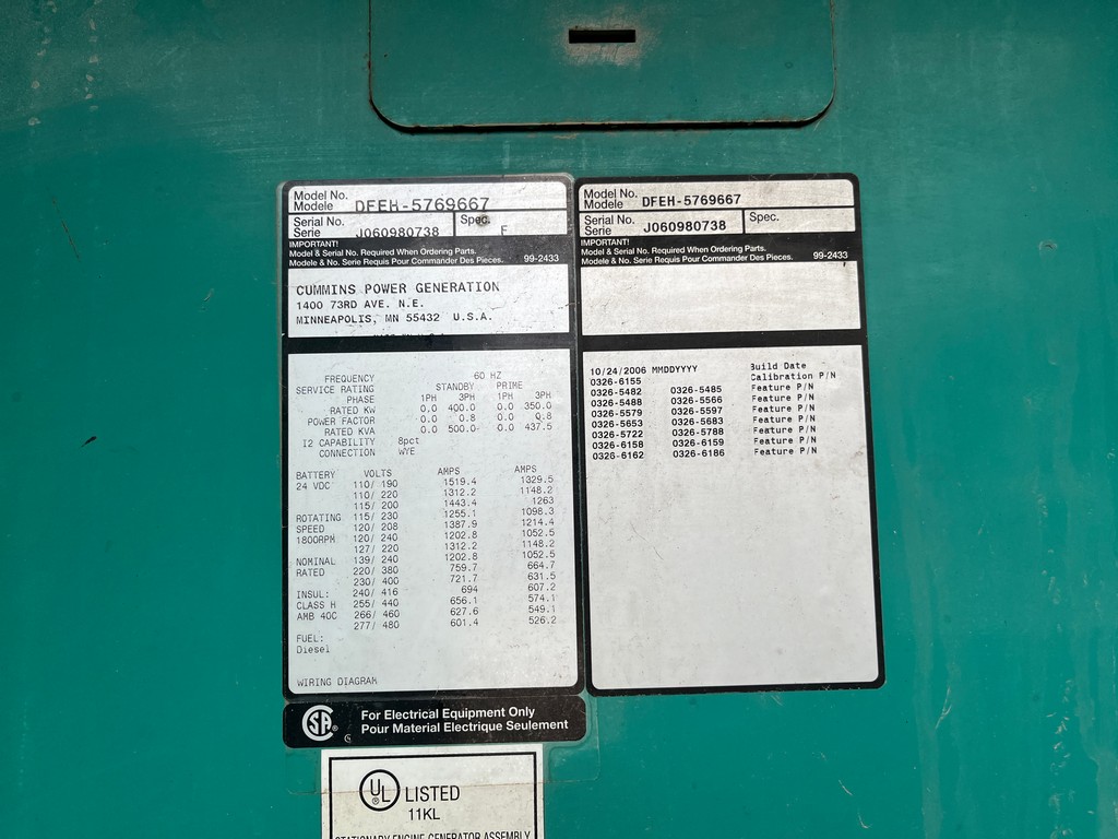Used Cummins DFEH Generator Set; 2006 Model – 1242 Hours; 400kW Standby Rated; 480/277V; QSX15-G9 Engine; Weather Enclosure; Base Fuel Tank; Load Tested and Ready to Ship