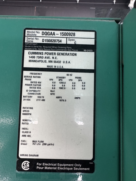 Used Cummins DQGAA Generator Set; 2015 Model – 347 Original Hours; 1250kW Standby Rated; 480/277V; Sound Attenuated Enclosure; Base Fuel Tank; Power Command Control Panel; Breaker; Tested and Serviced