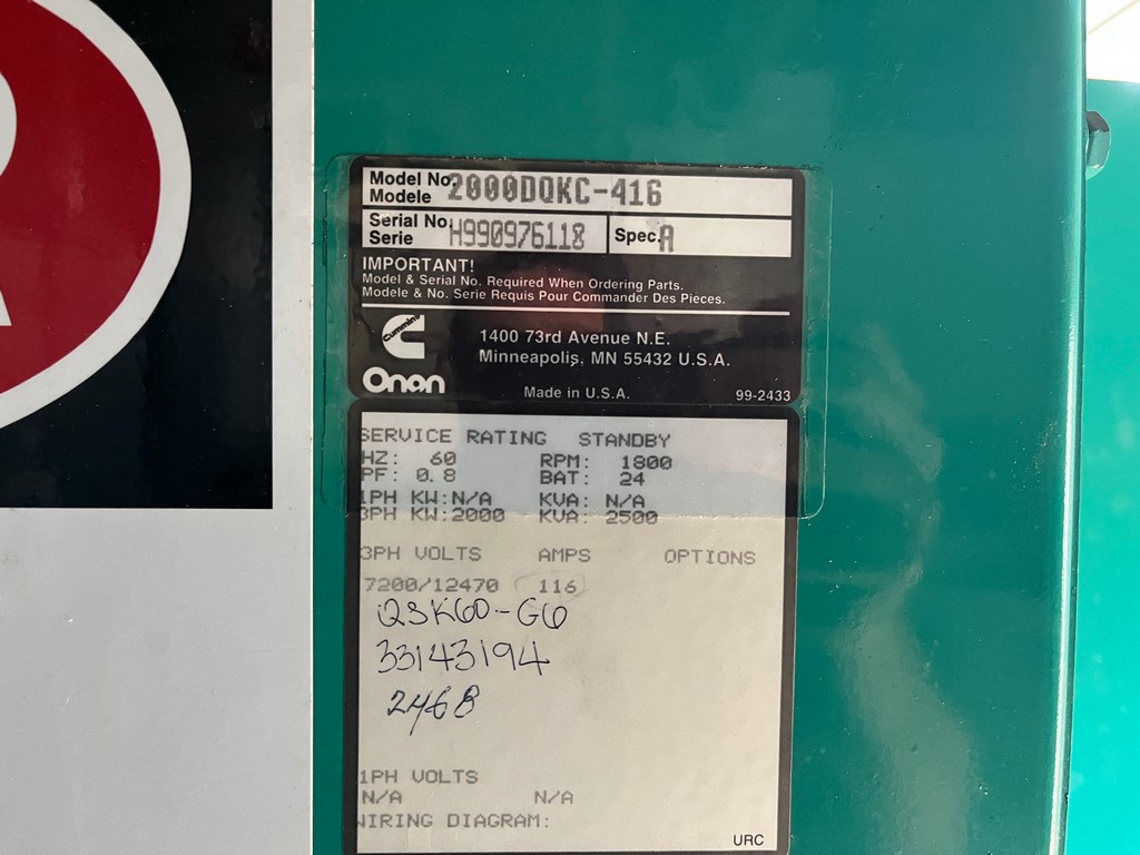 Low Hour Used Cummins QSK60-G6 Generator Set; 1999 Model – 1318 Original Hours; 2000kW Standby Rated; 12,470V; Sound Attenuated; Base Fuel Tank; Power Command Controller; Onboard 15kV Utility Grade Switchgear; Cleaned, Serviced, and Load Tested; In Stock – Immediately Available.