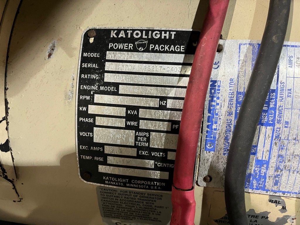 Used Katolight D135FRJ4 Generator Set; 2002 Model – 392 Hours; 135kW Standby Rated; 480/277V; Weather Enclosure; Base Fuel Tank; Analog Controls; Breaker; Serviced, Tested, Painted