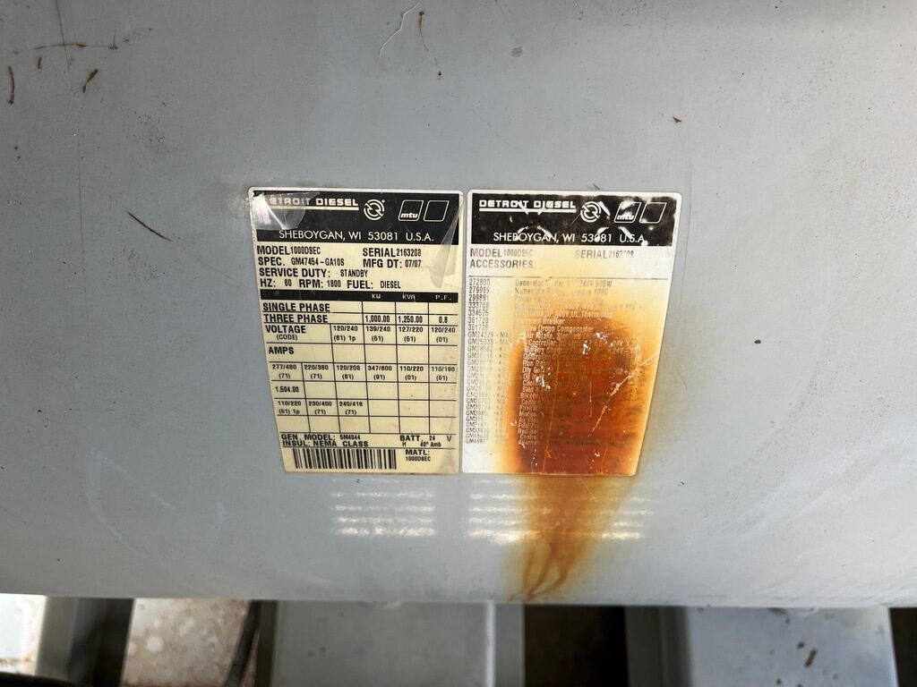 Used MTU 1000DSEC Generator Set; 2007 Model – 418 Hours; 1000kW Standby Rated; 480/277V; Weather Enclosure; Control Panel; 1600A Breaker; MTU 16V2000 Engine; Jacket Water Heater; Battery Charger; 500G Base Fuel Tank; Load Tested & Serviced – Two Available